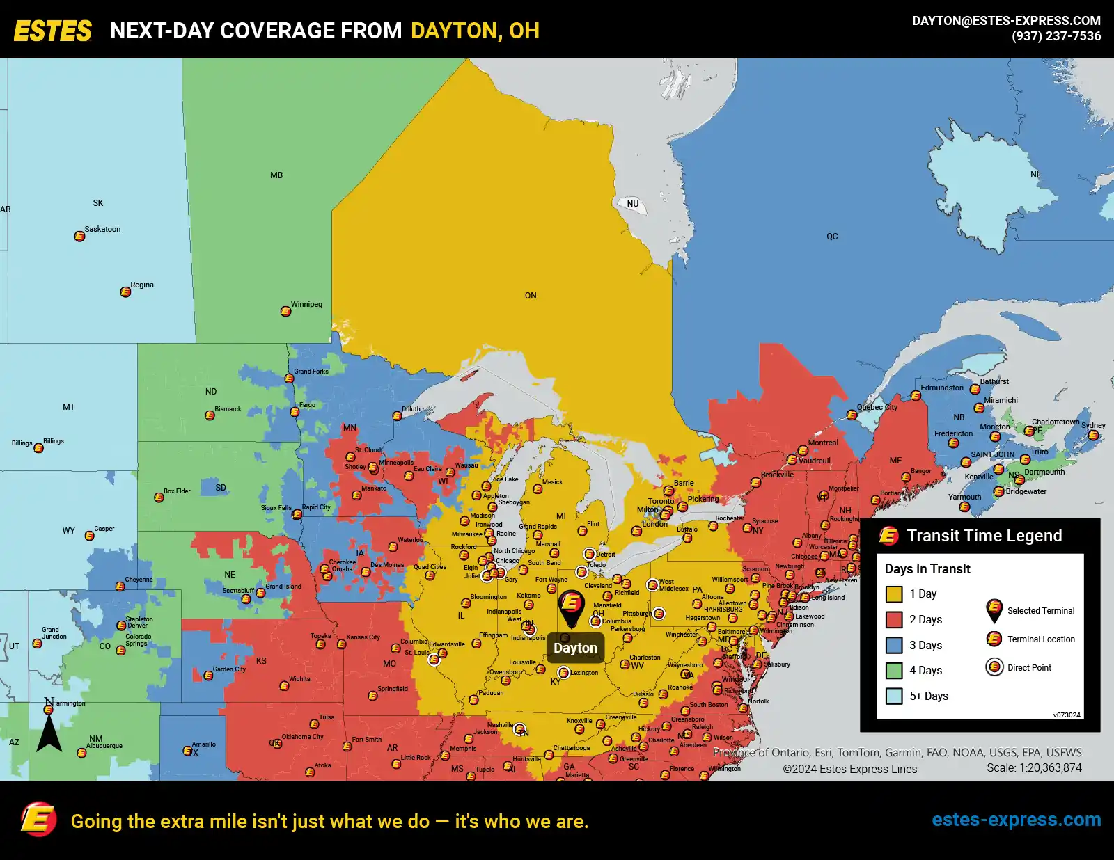 Need reliable LTL freight shipping? Estes offers next-day LTL from the Dayton-Kettering-Springfield area to Chicago, Philadelphia, Toronto, Indianapolis, Detroit, Cleveland, Cincinnati, Columbus, Milwaukee, Buffalo, Baltimore, Pittsburgh, and St. Louis.