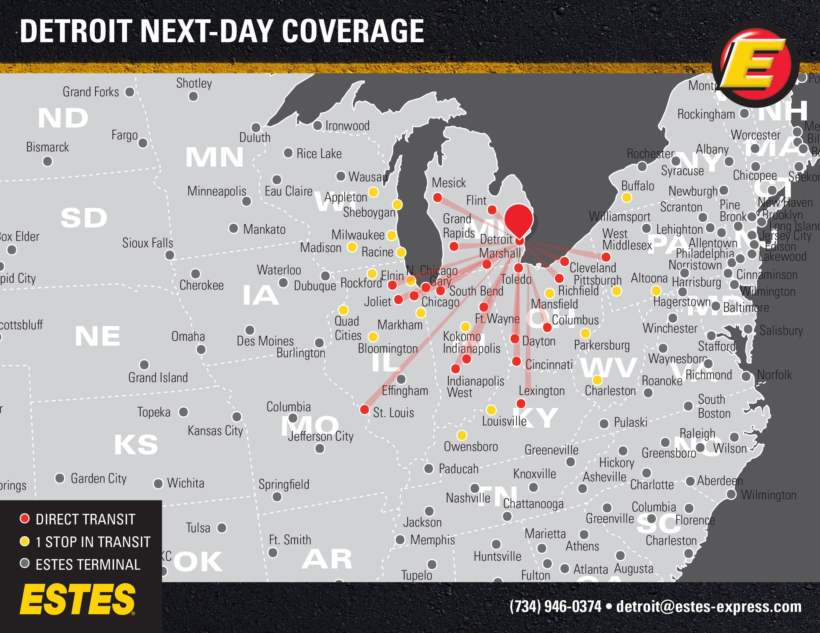 As one of our 26 hubs, Detroit provides direct lanes to service centers throughout the region—each running every night like clockwork while offering reduced freight handling and superior reliability. Thanks to our vast network, Estes offers nearly 7,000 next-day lanes nationwide to get your shipments where they need to go, when they need to get there. Learn about the benefits of shipping through this hub facility.