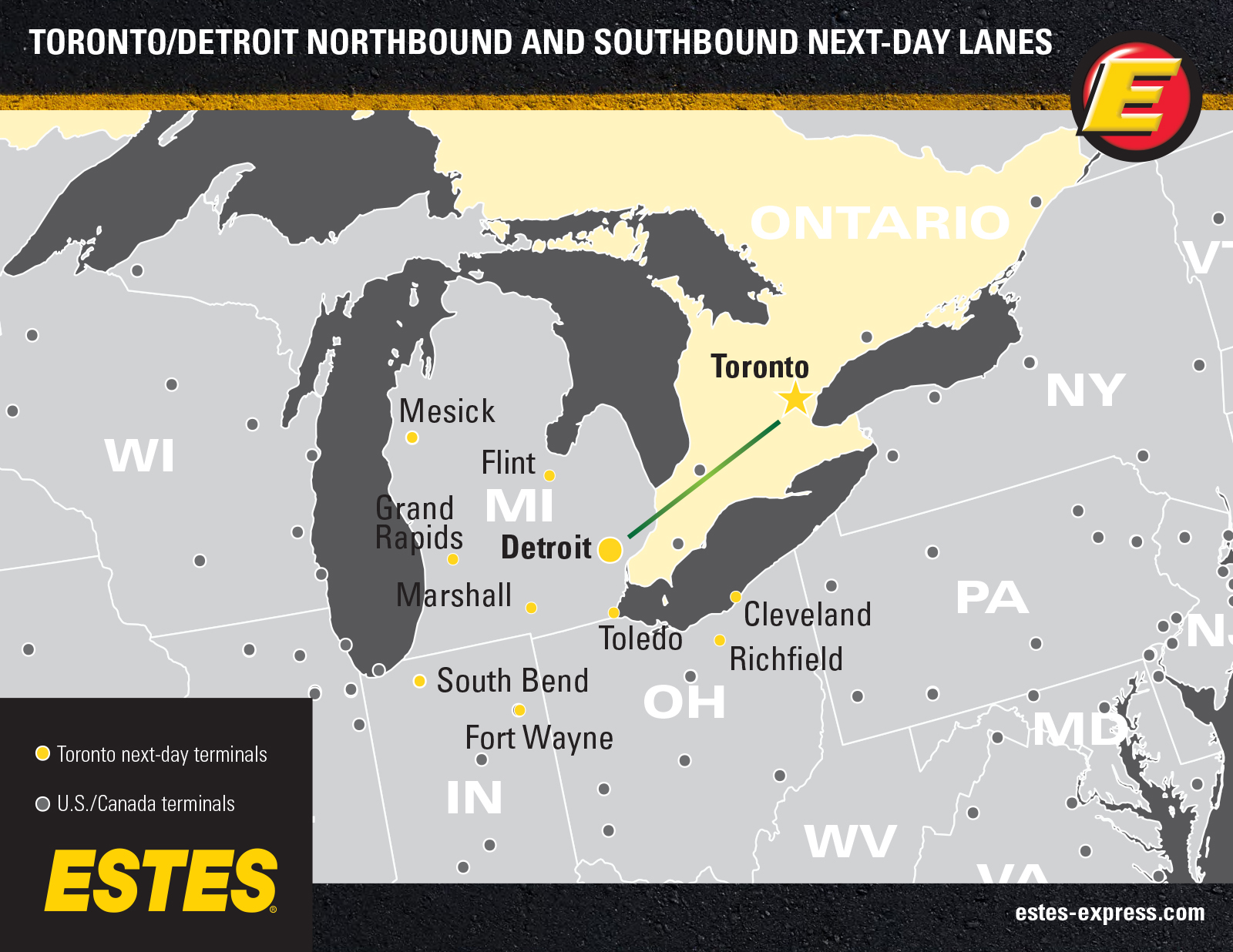 Estes offers reliable next-day LTL shipping into Toronto from the Midwest and Northeast, and into London, and Windsor from the upper Midwest, as well as southbound next-day service from Toronto to the Midwest—all supported by our nationwide team of Border Concierges and featuring some of the best freeze protection in the industry.