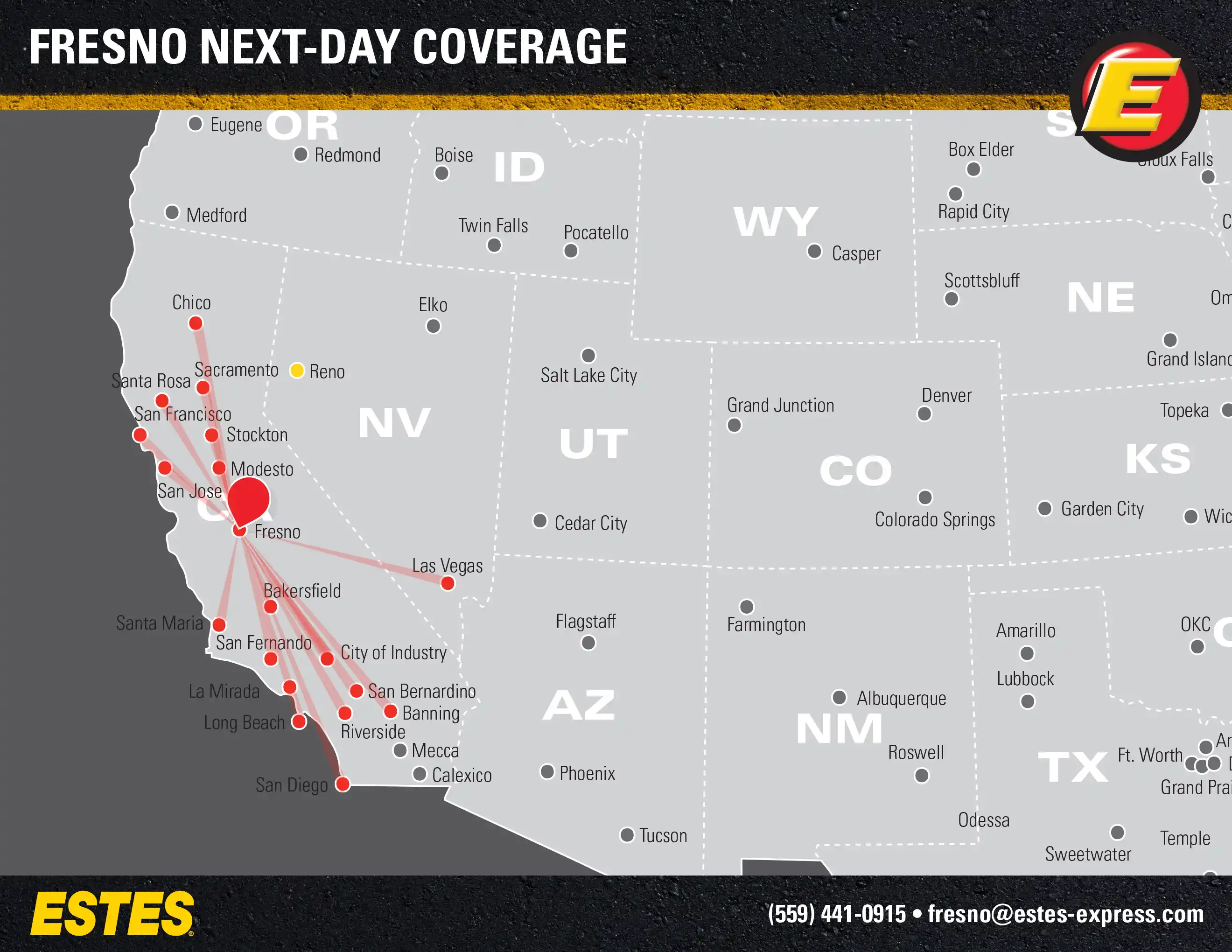 Estes offers next-day direct LTL freight shipping from the Fresno-Visalia-Clovis area to Los Angeles, San Francisco, San Diego, Las Vegas, San Jose, Sacramento, San Bernardino, Riverside, Bakersfield, Chico, and more, as well as next-day LTL to Reno.