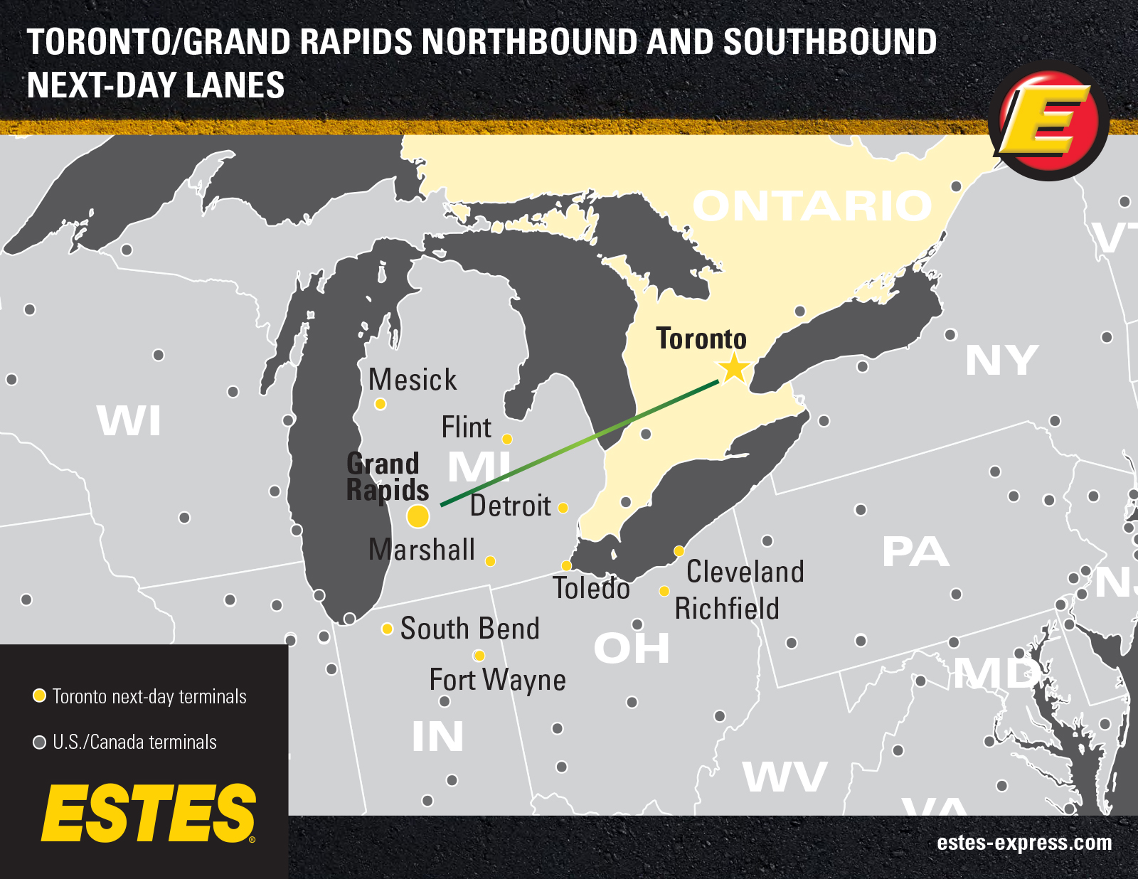 Estes offers reliable next-day LTL shipping into Toronto from the Midwest and Northeast, and into London, and Windsor from the upper Midwest, as well as southbound next-day service from Toronto to the Midwest—all supported by our nationwide team of Border Concierges and featuring some of the best freeze protection in the industry.