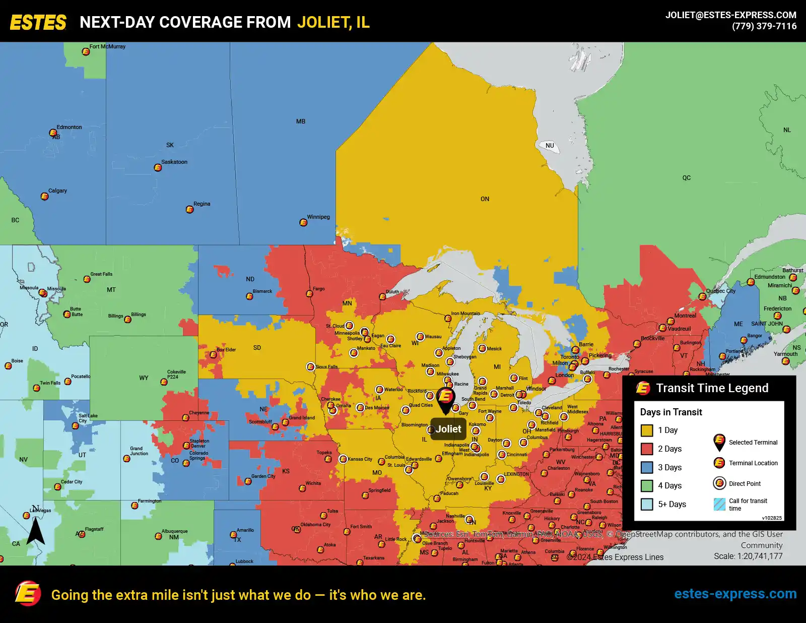 Estes offers reliable next-day LTL shipping from Joliet to Toronto and Windsor, and nearby Ontario destinations—supported by our nationwide team of Border Concierges and featuring some of the best freeze protection in the industry.