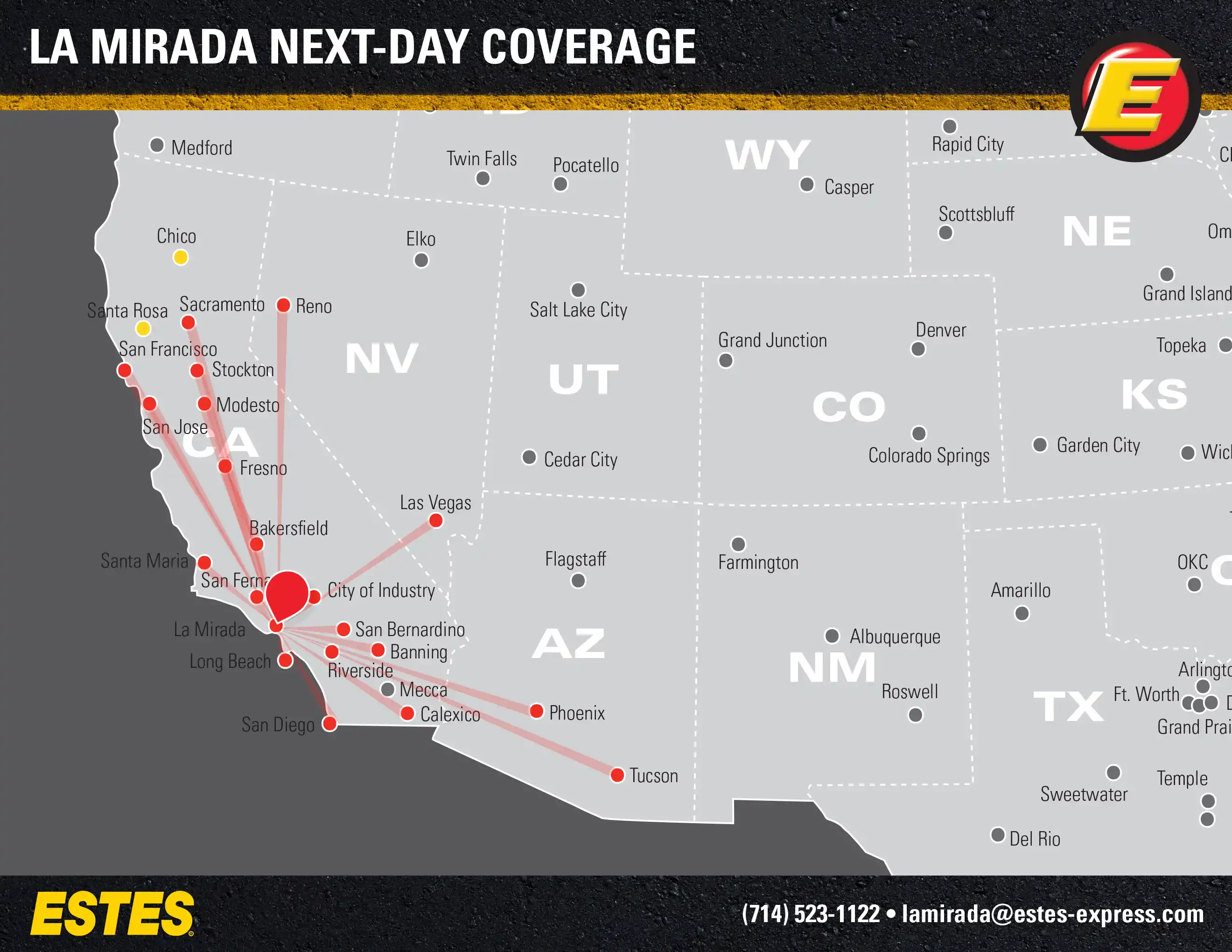 Estes offers next-day direct LTL freight shipping from the Downey-Whittier-Buena Park area to Los Angeles, San Diego, San Francisco, Las Vegas, Phoenix, San Jose, Tucson, Sacramento, Fresno, Reno, Bakersfield, and Stockton—and more.