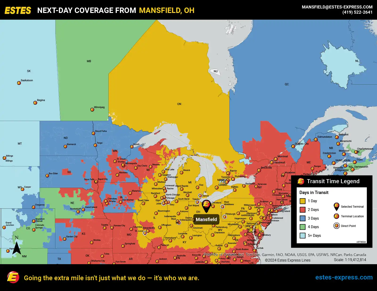 Estes also offers reliable next-day LTL shipping from the Canton-Mansfield area to Toronto, London, and Windsor—supported by our nationwide team of Border Concierges and featuring some of the best freeze protection in the industry!