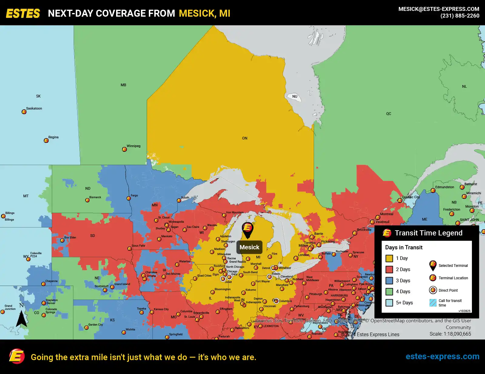 Thanks to our vast North American transportation network, Estes offers nearly 7,000 next-day lanes and 270 million next-day points to get your local shipments where they need to go, when they need to get there. And we offer competitive next-day transit pricing! Whether you need long-haul service, next-day delivery or anything in between—Estes does it all.