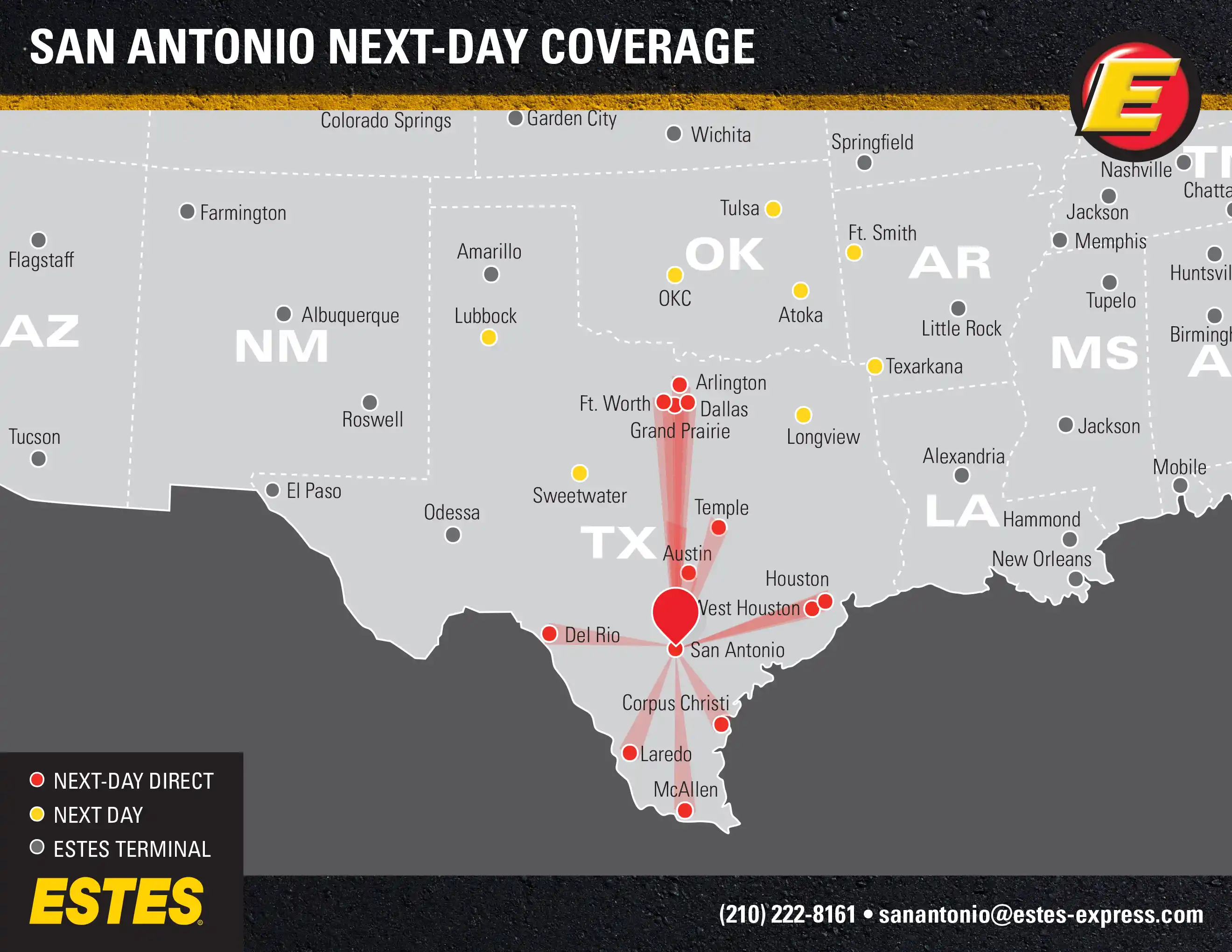 Contact us today to find out why San Antonio counts on us to get their LTL freight where it needs to go, when it needs to get there. From short-haul to long-haul, Estes does it all.