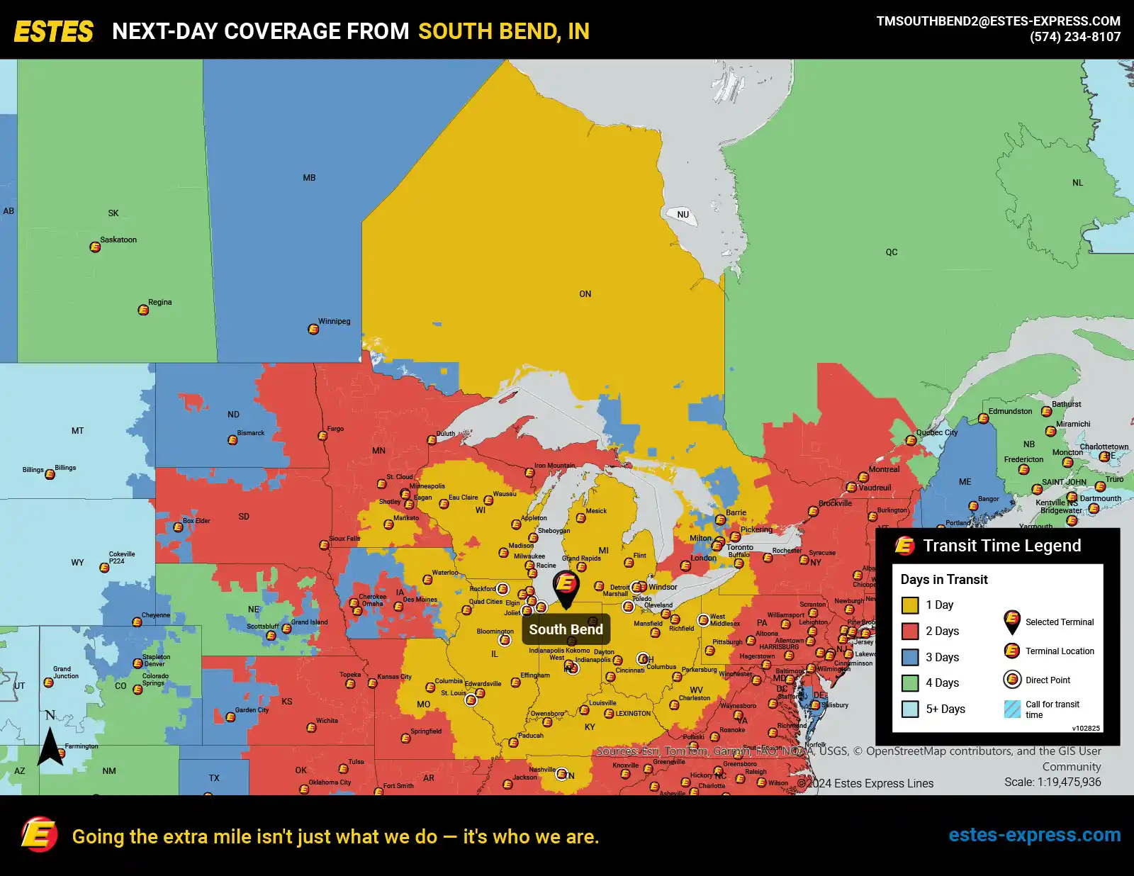 Thanks to our vast North American transportation network, Estes offers nearly 7,000 next-day lanes and 270 million next-day points to get your local shipments where they need to go, when they need to get there. And we offer competitive next-day transit pricing! Whether you need long-haul service, next-day delivery or anything in between—Estes does it all.
