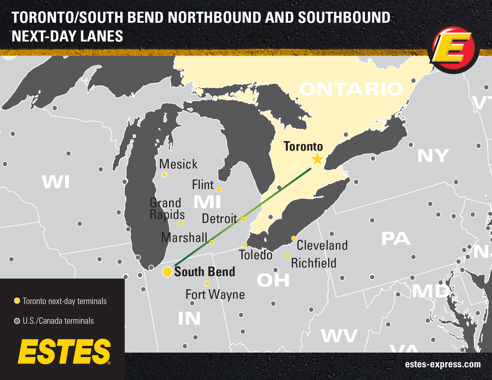 Estes offers reliable next-day LTL shipping into Toronto from the Midwest and Northeast, and into London, and Windsor from the upper Midwest, as well as southbound next-day service from Toronto to the Midwest—all supported by our nationwide team of Border Concierges and featuring some of the best freeze protection in the industry.